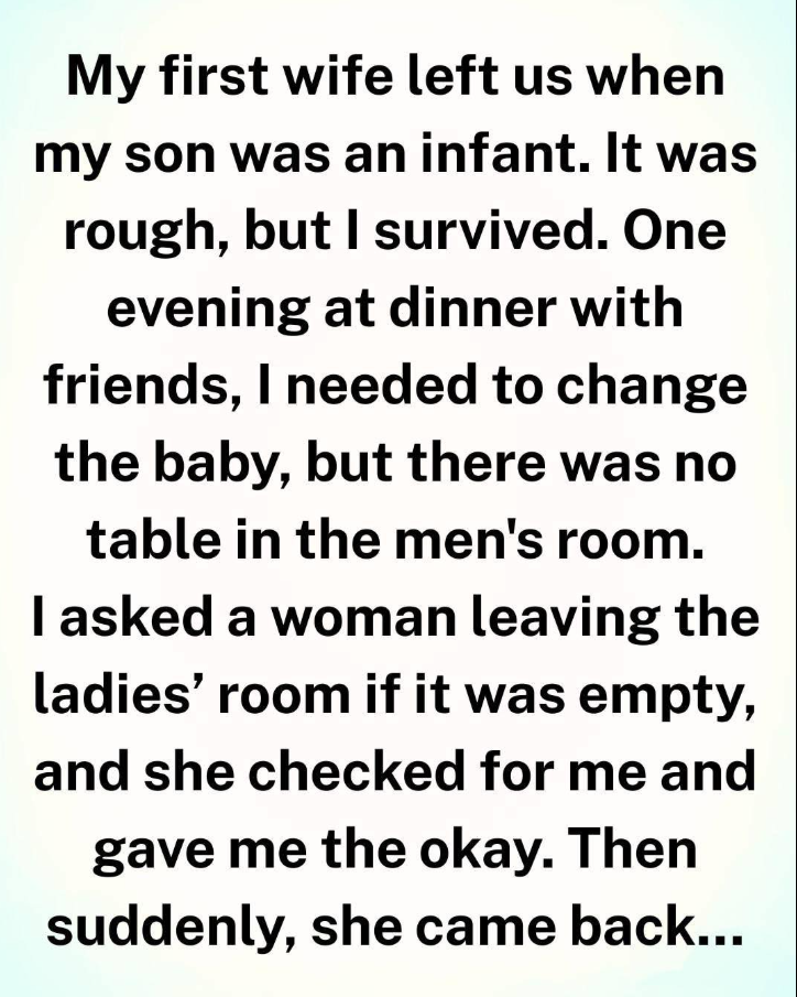 My first wife left us when my son was an infant. Life felt overwhelming, but somehow we kept moving forward. One evening at dinner with friends, I needed to change my baby’s diaper, only to find no table in the men’s room. A woman stepping out of the ladies’ room kindly checked if it was empty and said I could use it. Just as I walked in, she suddenly returned with a thoughtful look on her face.