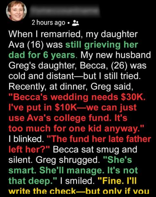 When Greg casually suggested using Ava’s college fund to pay for his adult daughter Becca’s wedding, I was stunned. That fund was created by Ava’s late father, David — his last gift to ensure she’d have the future he never did. Greg’s tone carried entitlement, and Becca’s silence spoke volumes, as if this decision had already been made without me. I stayed calm, knowing I needed a clear plan to protect what truly mattered.