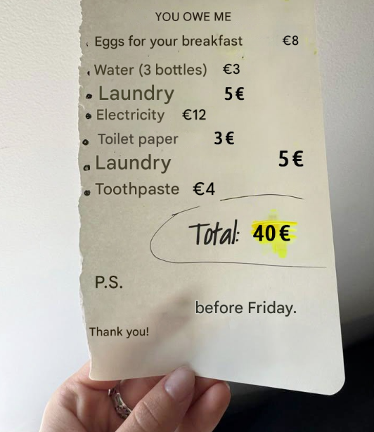 Then, on Monday morning, a surprise awaited me on the counter. A small piece of paper. Not a kind word. Not a thank you. A bill. Yes, a bill: 40 euros for what she called "maintenance fees." And, to top it all off: a line item for the toilet paper used.